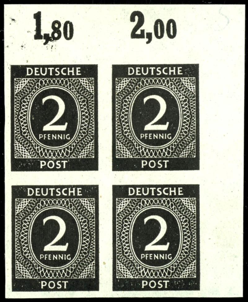 Block of four with the 2 Pf Ziffer stamp, flawless, mint never hinged, with the upper stamps only perforated at the bottom, not signed, catalog value 2000.- (912Udr) 2 Pf Ziffer Eckrandviererblock, tadellos, postfrisch, dabei die oberen Marken nur unten gezähnt, nicht signiert, Mi 2000.- (Image)