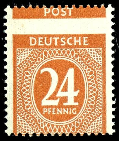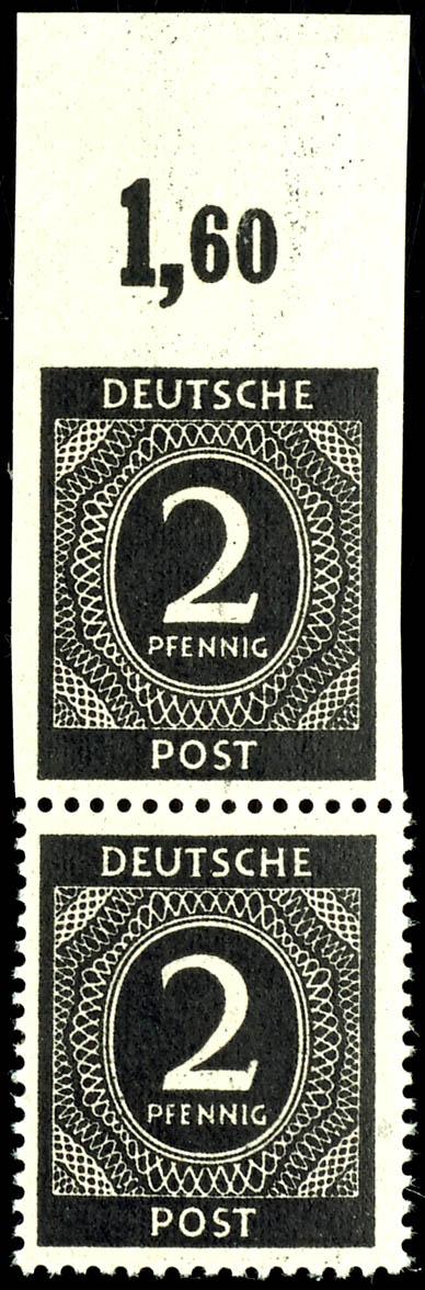 24 Pf Ziffer in a vertical pair with an upper margin, flawless, mint never hinged, the upper stamp is three-sided unperf., not signed, Mi 1300.- (925Udr) 24 Pf Ziffer im senkr. Oberrandpaar, tadellos, postfrisch, obere Marke dreiseitig ungezähnt, nicht signiert, Mi 1300.- (Image)