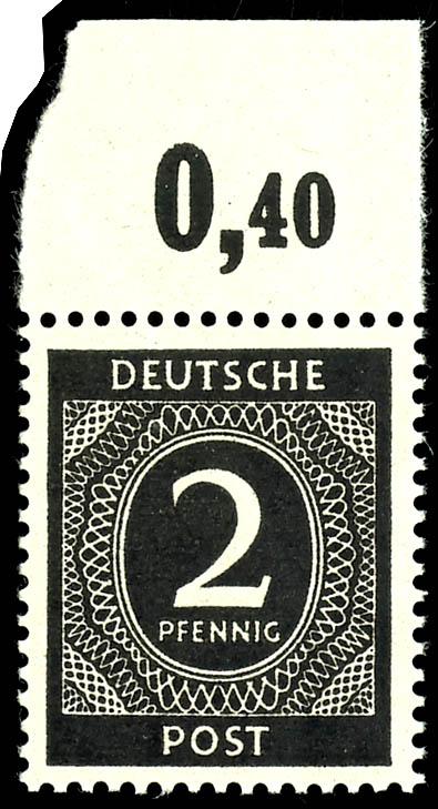 2 Pf, lying watermark 'Ziffer', flawless, mint never hinged, upper margin piece from the printing plate, not perforated, unsigned, certificate by Hohmann UPf B. (912YYPOR ndgz) Certificate 2 Pf Ziffer liegendes Wasserzeichen, einwandfrei, postfrisch, Oberrandstück im Plattendruck nicht durchgezähnt, nicht signiert, Attest Hohmann UPfB (Image)