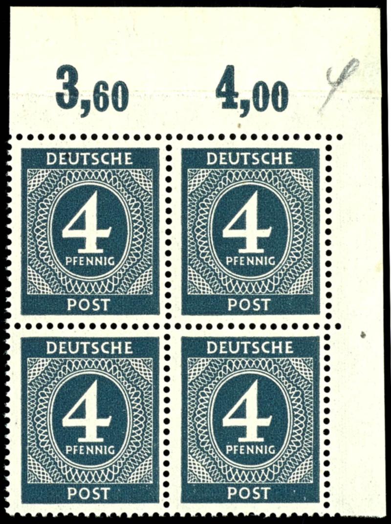 4 Pf Ziffer block of four with right-hand margin, flawless, mint never hinged, paper strip attached to the upper margin, unsigned, catalog value 1000.- (914PA) 4 Pf Ziffer Eckrandviererblock re. o., tadellos, postfrisch, geklebte Papierbahn im Oberrand, nicht signiert, Mi 1000.- (Image)