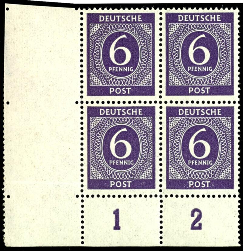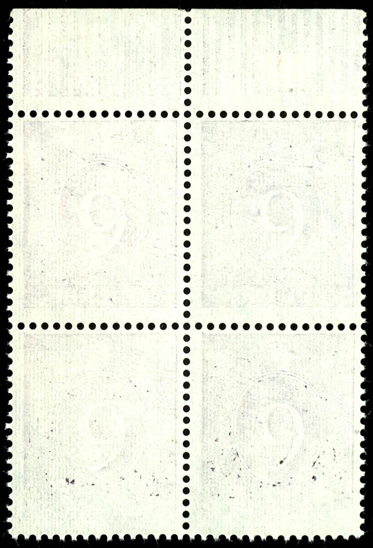 6 Pf. letter, corner block of four on the left bottom edge, mint, with creases, perforation of the adjacent sheet visible due to sheet flaw, field 81 partially, field 91 completely, unsigned, certificate Hohmann UPf B: \no other piece known\, not listed in Michel. (916PUR) Certificate 6 Pf. Ziffer, Eckrandviererblock links unten, postfrisch, Büge, durch Bogenverschnitt Zähnung des daneben liegenden Bogens erkennbar, Feld 81 teilweise, Feld 91 vollständig, nicht signiert, Attest Hohmann UPfB: \...kein weiteres Stück bekannt\ im Michel nicht bewertet (Image)