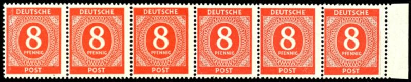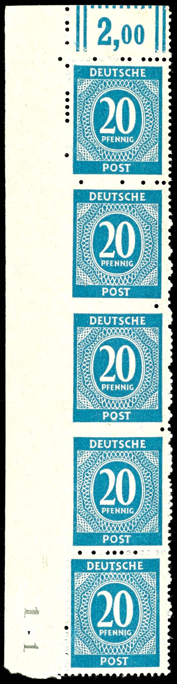 20 Pf denomination, flawless, mint never hinged, vertical strip of five with margin, perforation missing on the side edge for one stamp, minimally indicated on two stamps, and completely absent on the top and bottom stamps, rare, unsigned. (924U) 20 Pf Ziffer, tadellos, postfrisch, senkrechter Eckrandfünferstreifen, Zähnung zum Seitenrand bei einer Marke komplett ausgefallen, bei zwei Marken minimal angedeutet, bei der obersten und untersten nicht komplett vorhanden, selten, unsigniert (Image)