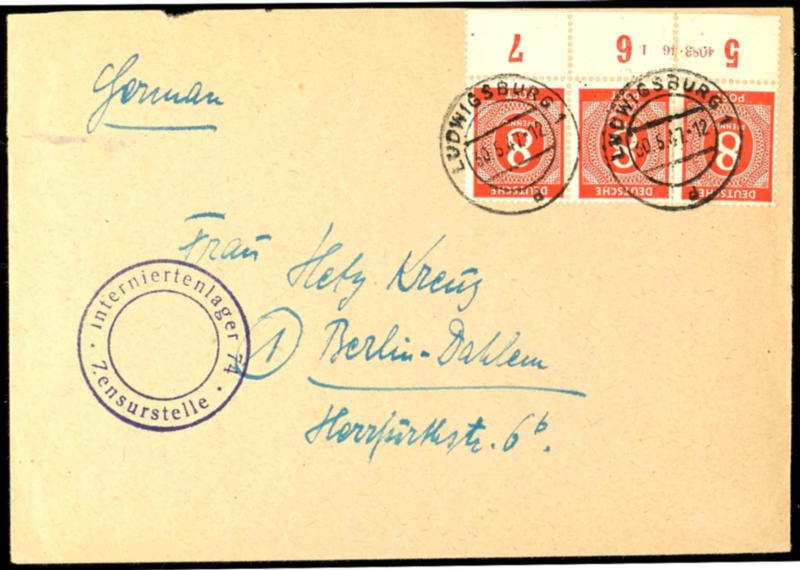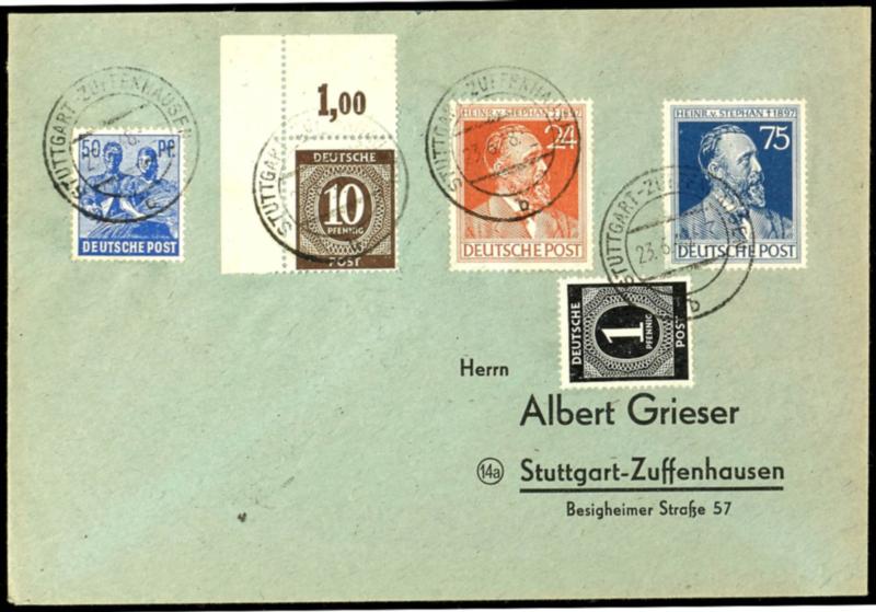 10 Pf denomination, c color, right upper corner piece with full perforation, used in a multiple franking of ten stamps on a collector's item, certificate by Hohmann UPf B, catalog value 2000.- (918cPOR/dgz/Mif) Certificate 10 Pf Ziffer, c-Farbe, rechtes oberes Eckrandstück, durchgezähnt, in Zehnfach-Mischfrankatur auf Sammlerbeleg, Attest Hohmann UPfB, Mi 2000.- (Image)