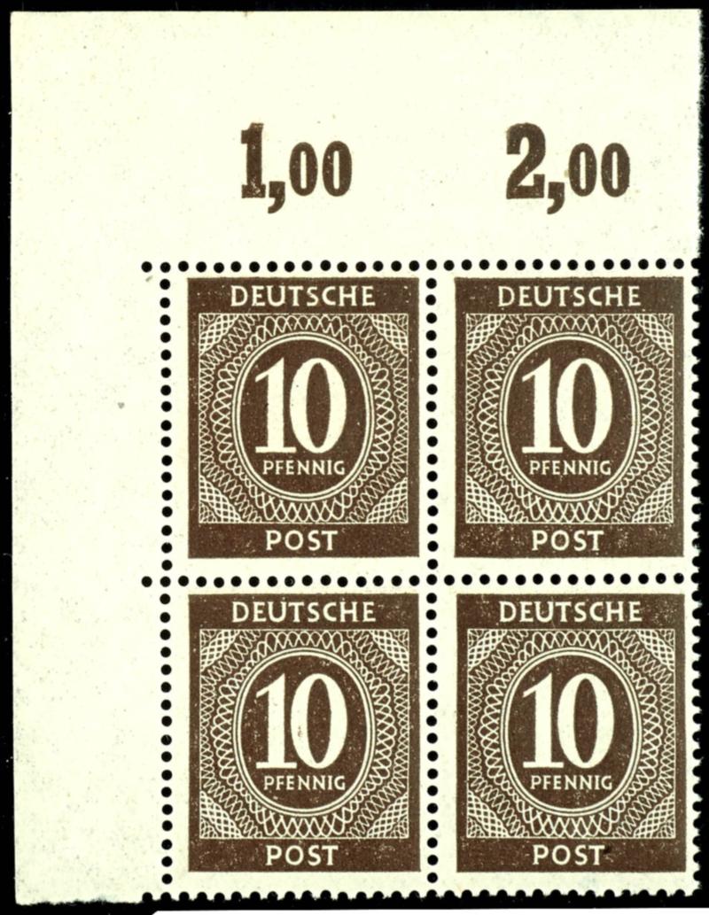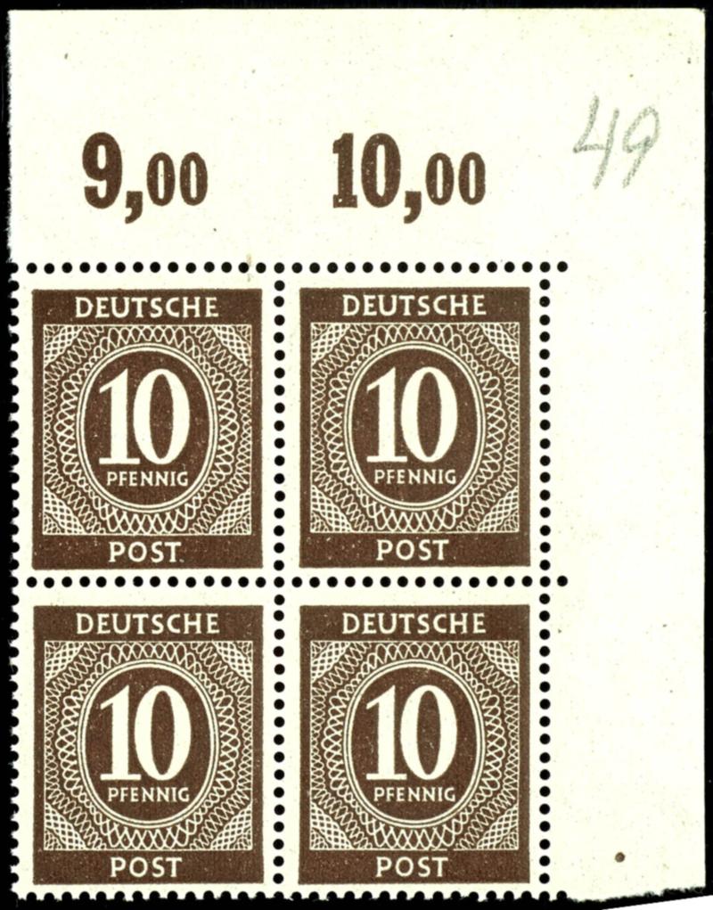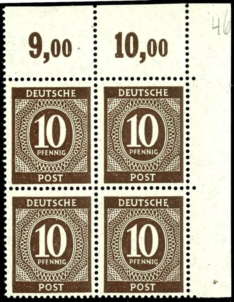 10 Pf denomination, c color, flawless, mint never hinged, four-margined block from the upper right corner, perf., unsigned, photo certificate Hohmann UPf B, catalog value 1000.- (918cPOR dgz) Certificate 10 Pf Ziffer, c-Farbe, einwandfrei, postfrisch, rechter oberer Eckrandviererblock, durchgezähnt, nicht signiert, Fotoattest Hohmann UPfB, Mi 1000.- (Image)