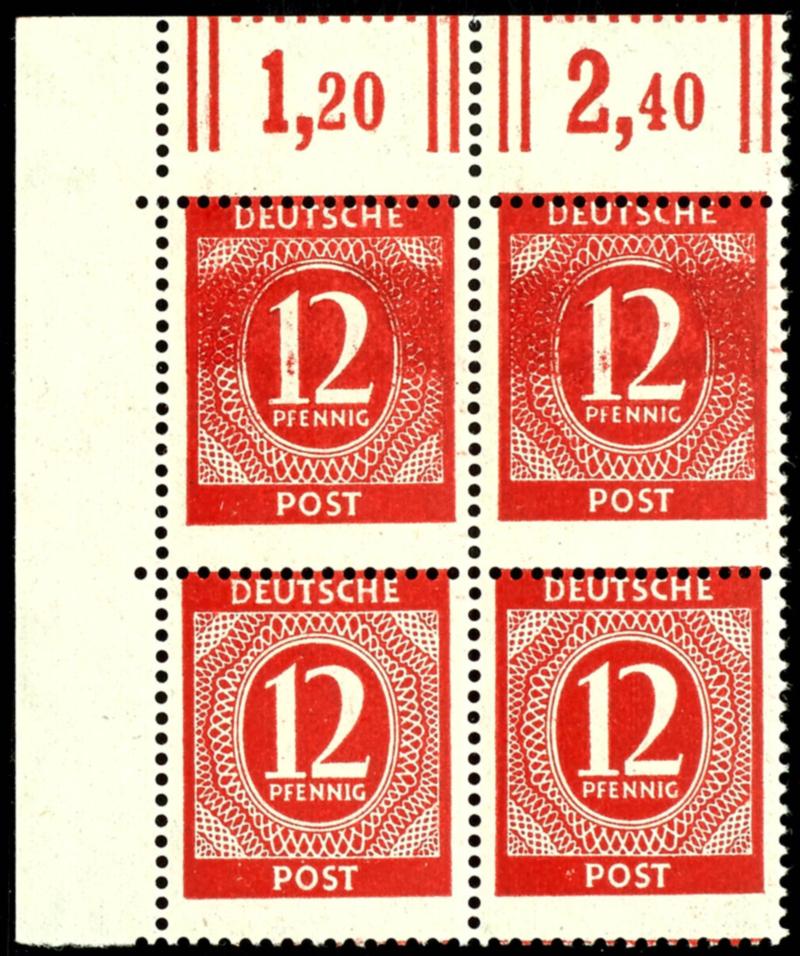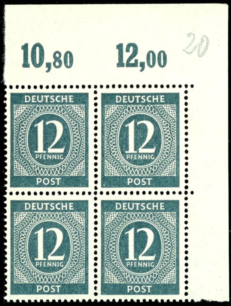 12 Pf denomination, dark color, flawless, mint never hinged, corner block of four with right-hand margin, expertized by Arge Kontrollrat, catalog value 400.- (920dPOR/ndgz) 12 Pf Ziffer, d-Farbe, tadellos, postfrisch, Eckrandviererblock rechts oben, geprüft Arge Kontrollrat, Mi 400.- (Image)