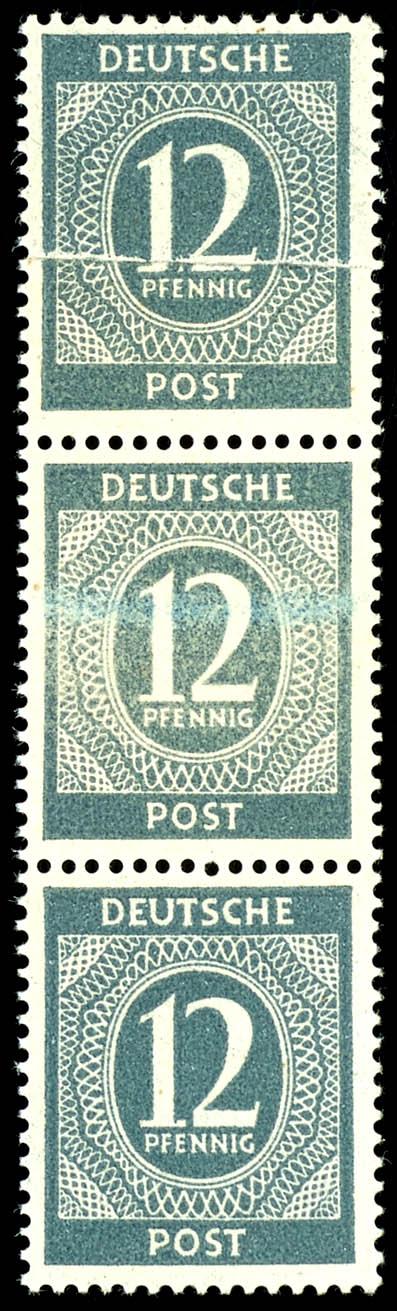 12 Pf denomination, flawless, mint never hinged, vertical strip of three, stamps with a flaw: glued paper strip, unsigned, catalog value 800.- (920PA) 12 Pf Ziffer, tadellos, postfrisch, senkrechter Dreierstreifen, Marken mit Abart geklebte Papierbahn, nicht signiert, Mi 800.- (Image)