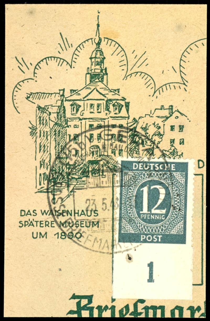 12 Pf Ziffer, used with special postmark Gera 23. 5. 48. - 13, Grosse Briefmarken Ausstellung (Great Stamp Exhibition), for the reconstruction of the museum, bottom corner piece, unperforated at the bottom on a postal fragment, unsigned, certificate by Schlegel BPP: \...the condition is flawless\. (920uU) Certificate 12 Pf Ziffer, gestempelt Sonderstempel Gera 23.5.48.-13, Grosse Briefmarken-Ausstellung, zum Wiederaufbau des Museums, Unterrandstück unten ungezähnt auf Briefstück, nicht signiert, Attest Schlegel BPP:\...die Erhaltung ist einwandfrei\ (Image)