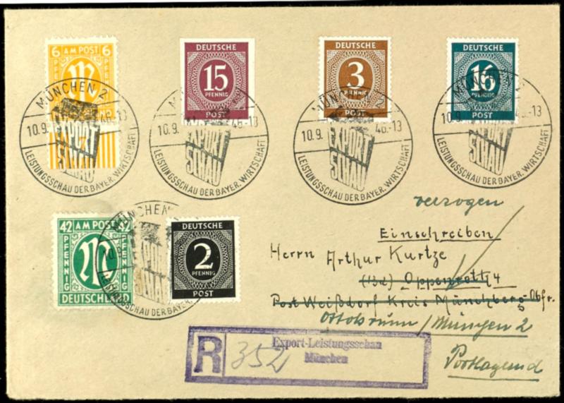 15 Pf denomination, unperforated, on a registered letter from Munich dated September 10, 1946, Michel on an unknown letter, as well as a single mint stamp, both unsigned. (921UMif/921U) 15 Pf Ziffer, ungezähnt in Mif auf R-Brief München 10.9.1946, Michel auf Brief unbekannt, sowie einzelne postfrische Marke, beides unsigniert (Image)