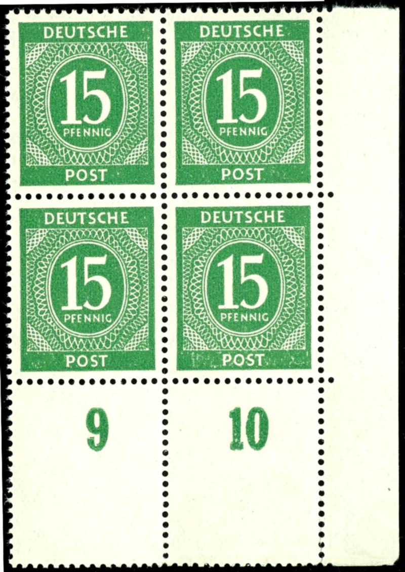 15 Pf denomination, flawless, mint never hinged, corner block of four with printer's mark F, catalog value 1200.- (922DZF) 15 Pf Ziffer, tadellos, postfrisch, Eckrandviererblock mit Druckerzeichen F, Mi 1200.- (Image)