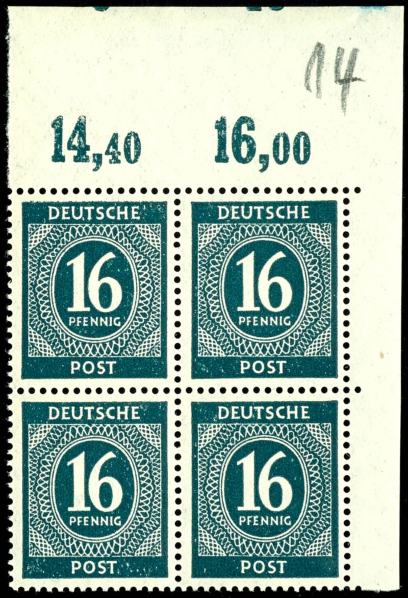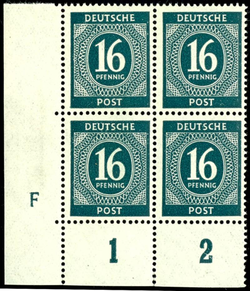 16 Pf denomination, flawless, mint never hinged, corner block of four with left margin, printer's mark F, not signed, Mi catalog number 350. (923DZ) 16 Pf Ziffer, tadellos, postfrisch, Eckrandviererblock links unten, Druckerzeichen F, nicht signiert, Mi 350.- (Image)