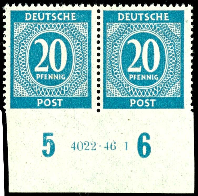 20 Pf denomination, flawless, mint never hinged lower margin pair with HAN 4022. 46 1, unperforated at the bottom, very rare, unsigned, Mi 2400.- (924UuHAN) 20 Pf Ziffer, einwandfrei, postfrisch Unterrandpaar mit HAN 4022.46 1, unten ungezähnt, sehr selten, nicht signiert, Mi 2400.- (Image)