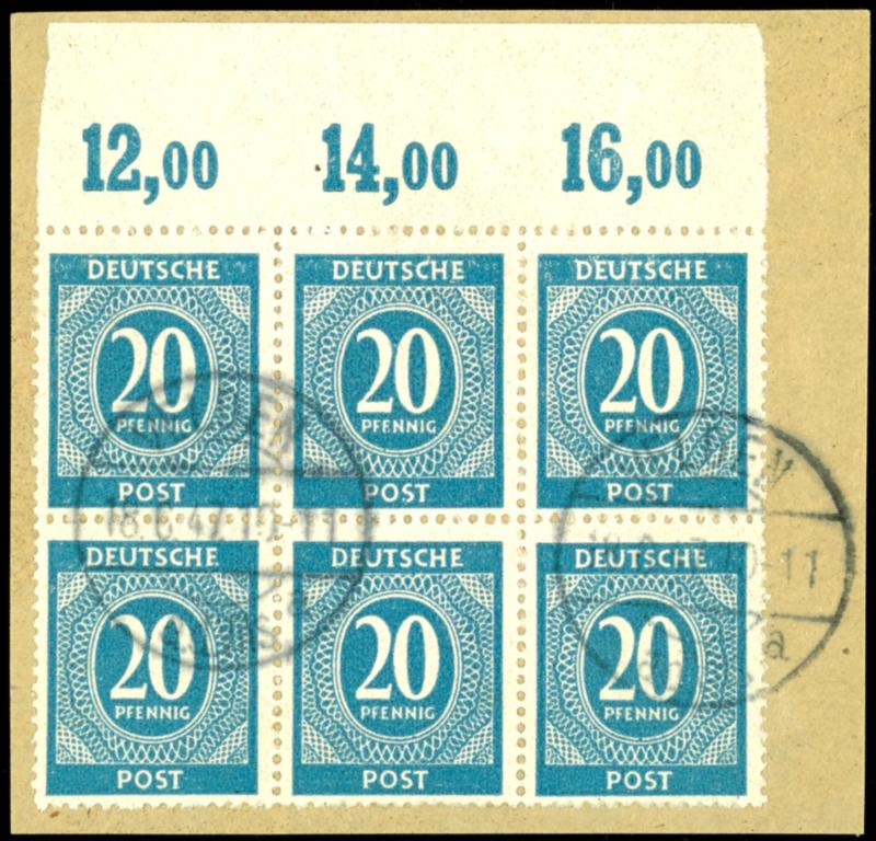 20 Pf Ziffer, d-color, used on a postal fragment, top margin with a block of six, not perfed, expertised by JB Arge Kontrollrat, Mi 1600.- (924dPOR ngdz) 20 Pf Ziffer, d-Farbe, gestempelt auf Briefstück, Oberrand 6er-Block, nicht durchgezähnt, geprüft JB Arge Kontrollrat, Mi 1600.- (Image)