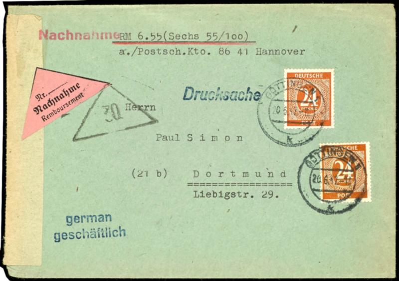 24 Pfennig digits (2) used as a postal franking in the 2nd weight class on a cash-on-delivery printed matter from \GOETTINGEN 20. 6. 47\ to Dortmund, extremely rare form of use, as a required item in this franking combination, a rarity of this issue and not listed in the Michel stamp catalog! (925(2)) 24 Pfennig Ziffern (2) als portogerechte Mehrfachfrankatur in der 2. Gewichtsstufe auf Nachnahme Drucksache von \GÖTTINGEN 20.6.47\ nach Dortmund, extrem seltene Verwendungsform,. als Bedarfsstück in dieser Frankatur-Kombination eine Rarität dieser Ausgabe und auch im Michel-Briefekatalog nicht verzeichnet! (Image)