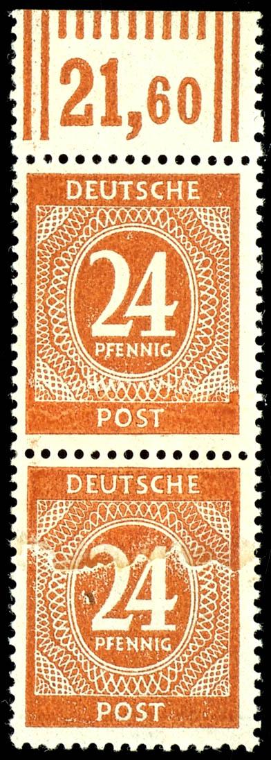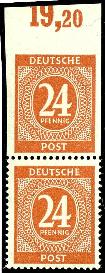 24 Pf denomination, flawless, mint never hinged, vertical pair from the upper margin, gummed paper strip, unsigned, catalog value 500.- (925PA) 24 Pf Ziffer, einwandfrei, postfrisch, senkrechtes Paar vom Oberrand, geklebte Papierbahn, nicht signiert, Mi 500.- (Image)