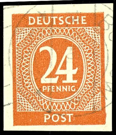 24 Pf denomination, imperforate, used, Borkow, February 18, 1946, unsigned, photographic finding by Schlegel, BPP. (925U) Certificate 24 Pf Ziffer, ungezähnt, gestempelt, Borkow 18.2.1946, nicht signiert, Fotobefund Schlegel BPP (Image)