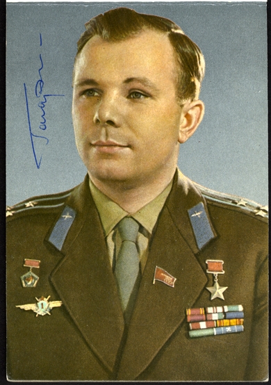 SPACE. A special booklet containing 13 color picture postcards of the early Soviet cosmonauts, signed on their photographs by Yuri Gagarin, A.G. Nikolayev, P.R. Popovich, V. Bykovsky, Valentina Tereshkova, V.M. Komarov (died in crash) and P.I. Belayev, others not signed, v.f. (Image)