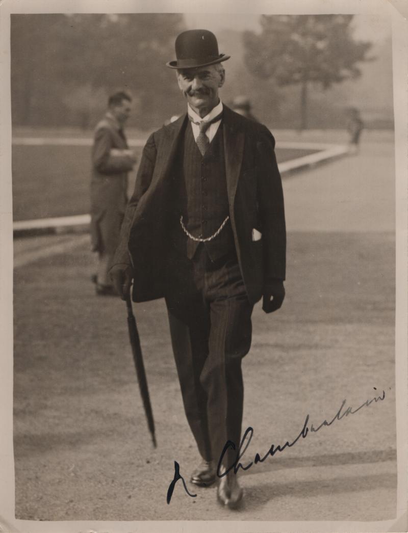 NEVILLE CHAMBERLAIN Signed B&W photograph of the British Prime Minister walking w/ umbrella & bowler hat; press photo from London News Agency (1932, while Chancellor of the Exchequer); signature in black marker, a couple wrinkles, F-VF (Image)