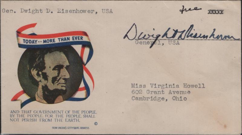 GEN DWIGHT EISENHOWER Minkus cacheted envelope of Abraham Lincoln, signed at UR by Eisenhower, ms "free" possibly in his hand as well, addressed to Ohio but no postal markings, some flap marks on back, o/w VF (Image)