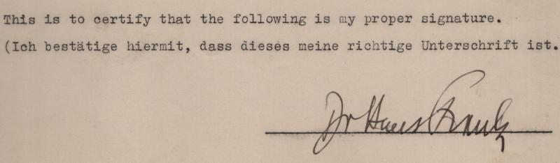 HANS FRANK, Hitler's lawyer and governor of Occupied Poland, cut with signature and typewritten note in English & German certifying it is his official signature, likely cut from papers while in Allied custody; He was sentenced to die by hanging in 1946; bonus: gummed paper announcement in Polish, likely meant to display in public by the Underground, incl quote from FDR and info on Hans Frank and rights violations, English translation provided; VF (Image)