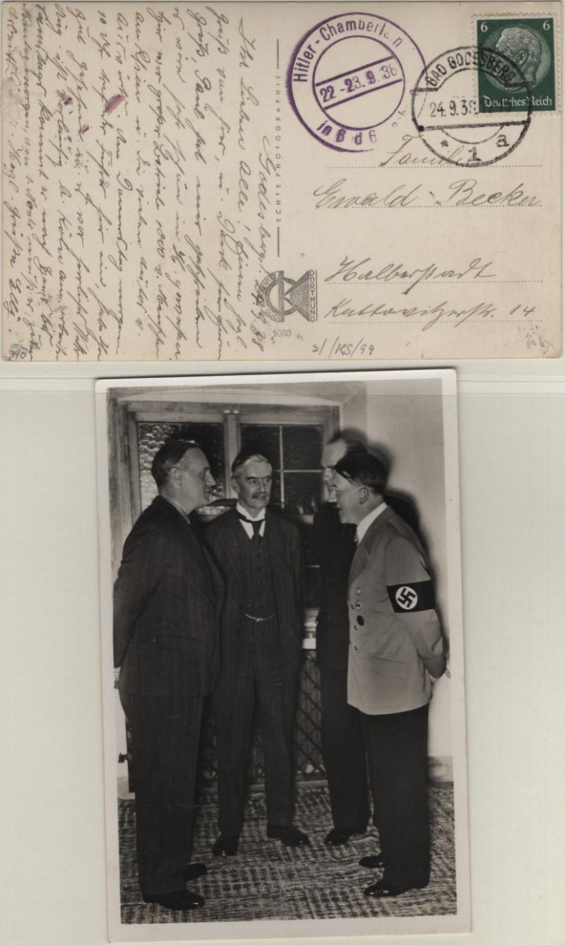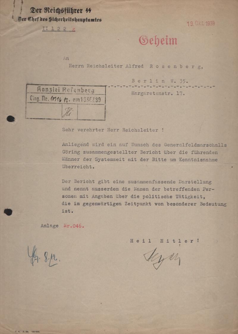 REINHARD HEYDRICH 1939 TLS on SS Main Security Office stationery, addressed to Alfred Rosenberg dated 19 Oct 1939; dry message mentioning Göring and keeping tabs on certain people's political leanings, signed in black ink at bottom, other handstamps, paper clip rust at UL, wartime correspondence between two war criminals; bonus: press photo of Heydrich (Image)