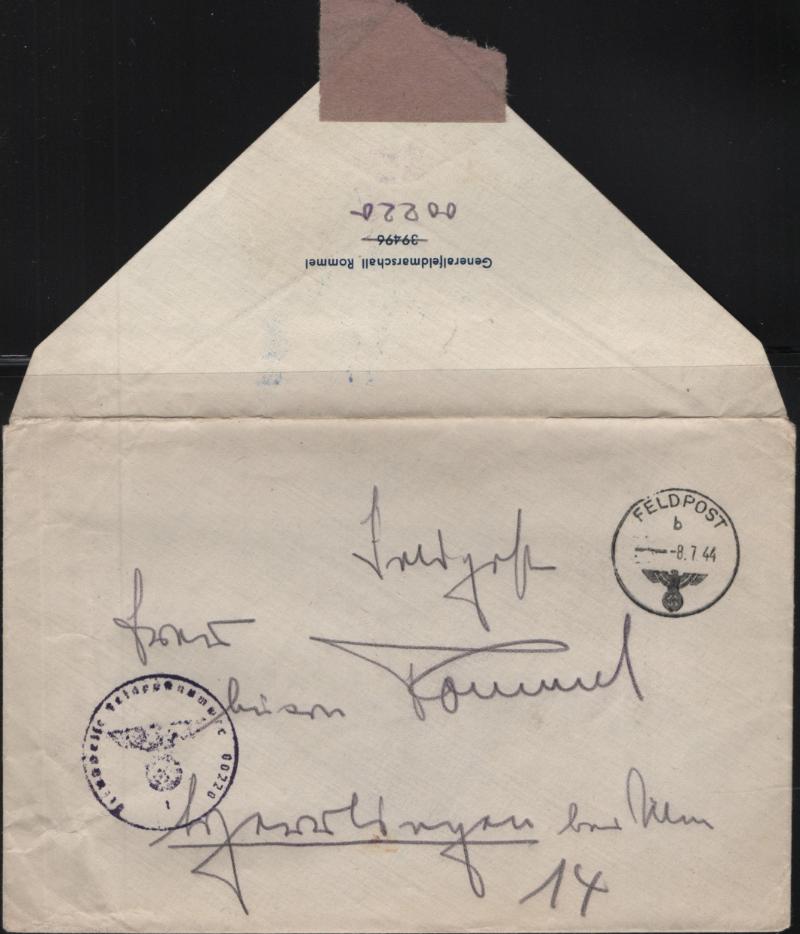 ERWIN ROMMEL Feldpost cover addressed in his own hand to wife, "Rommel" on address is just like his regular signature; envelope is stationery, "Generalfeldmarschall Rommel" on back flap with Feldpost number "39496" crossed out (Africa) and "00220" penciled in (Army High Command); proper handstamp and postmark dated 8 July 1944, a few weeks after D-Day but just before his injury; within a few months he committed suicide by order of Hitler; postcard of him in uniform included; VF (Image)