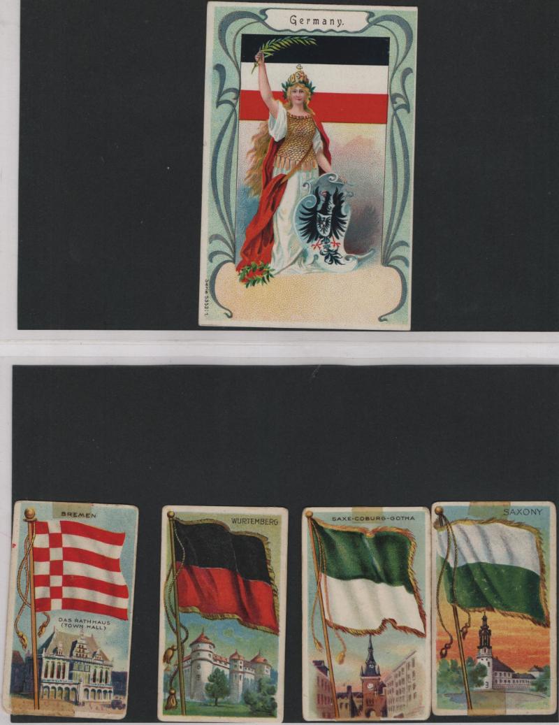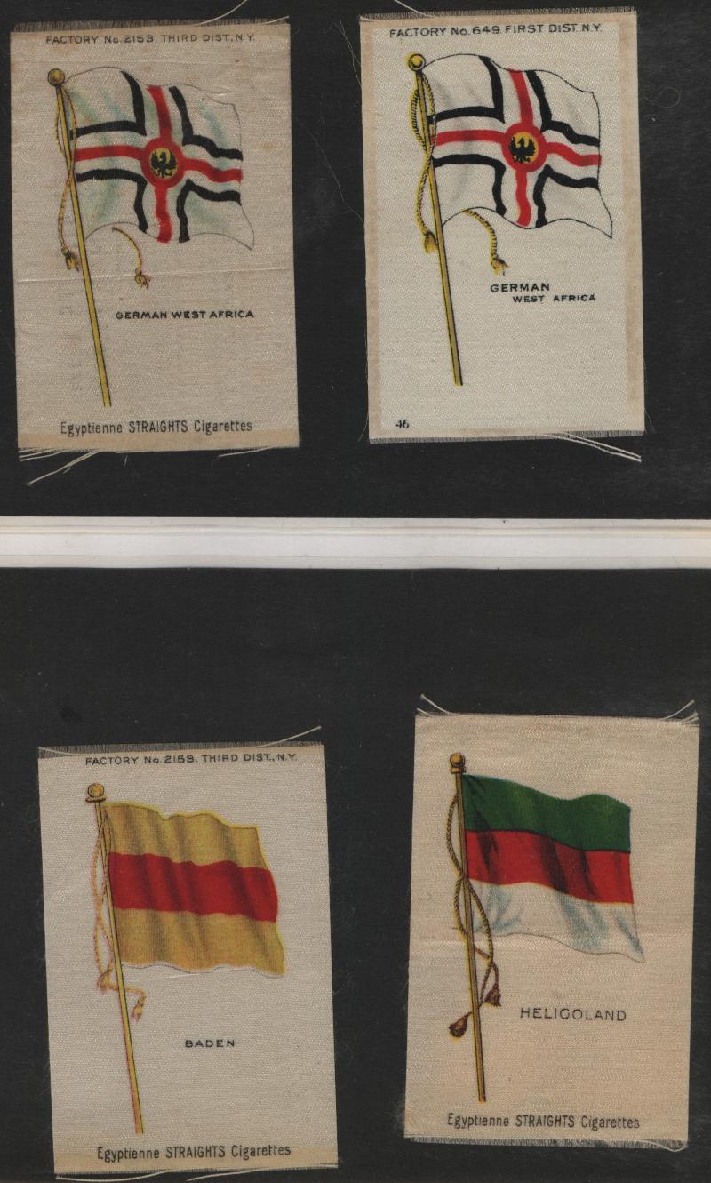 (22) Silk cigarette "cards" w/ flags, all German related, incl Munich, Berlin, Prussia, German East Africa, national flag, Heligoland, Baden, Bavaria, royal standard and others; diff cigarette companies given, gen VF (Image)
