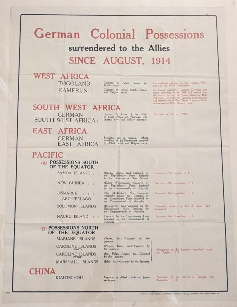 British poster c.1916 titled "German Colonial Possessions surrendered to the Allies", gives list of each German colony and information regarding details of its surrender or continued resistance, printed by Johnson, Riddle & Co., previously folded, in frame (Image)