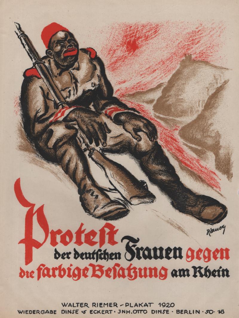 Original 1920 poster "German women protest the colored occupation of the Rhine" w/ caricature of a French African soldier w/ rifle; "Walter Riemer ~ Plakat 1920" at bottom; 215x276mm; VF (Image)