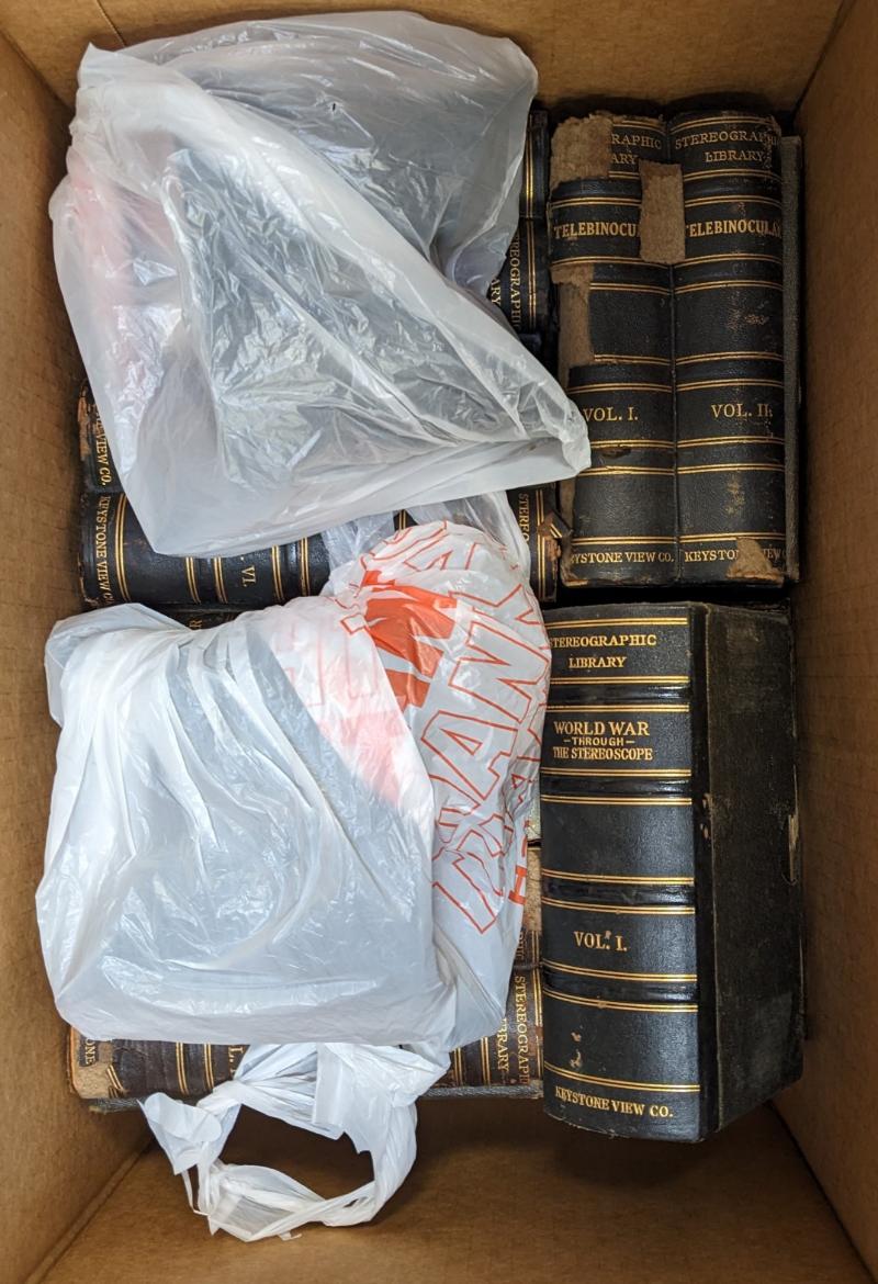 Accumulation Stereographic Library "World War" by Keystone View Co. (5) holders in the form of two leather bound books, containing (100s) stereoscopic cards w/ photographs of WWI; containers marked Vol I & II (3), Vol III & IV (1) and Vol V & VI (1); additional smaller box marked Vol 1 w/ just a few cards; Unclear if sets are complete; also includes (2) black Keystone viewers and (2) hardbound guide books to the collection "Photographs of Prominent Military Men and their Comments on "The World War Through the Telebinocular"; the outer cases and books have some damage, the stereocards are in VF to XF conditions. (Image)
