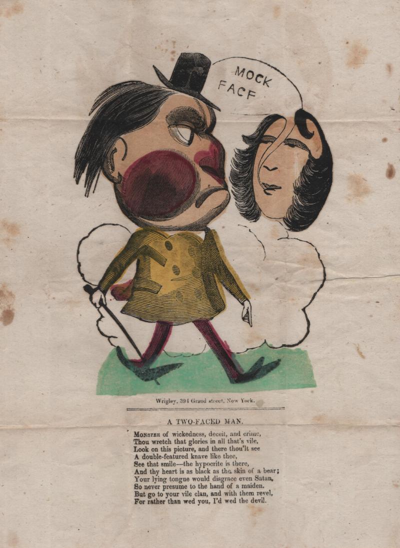 VINEGAR Valentine collection in Lighthouse album; one is truly vintage 1840s "A Two-Faced Man" w/ original stampless envelope, addressed to a doctor! a few half-page or postcard size from early to mid-20th Cent, majority (128 different) are full page size colorful traditional Vinegar Valentines making fun of appearances or professions, drunks, old maids, gossipers and other unpleasant folk; some have been folded, others w/ worn or fragile edges as the paper used for these was often lower quality; gen F-VF; bonus: one genuine fancy Victorian Valentine w/ fancy embossed envelope w/ pair 3¢ stamps; Rare to find such a large & varied collection. (Image)