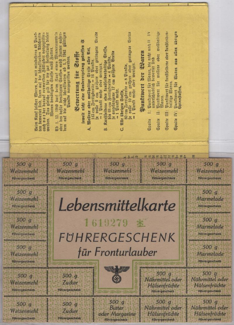 GERMANY WWII Wartime Forgery of supplemental ration slip for soldiers on leave from the Eastern Front, "Lebensmittelkarte / Führerheschenk für Fronturlauber" w/ coupons for sugar, jam, butter, flour and legumes; green serial number; a period forgery of these valuable extra rations; additional yellow ration card, folded, w/o stamps, also a forgery; Likely produced by the British; VF (Image)