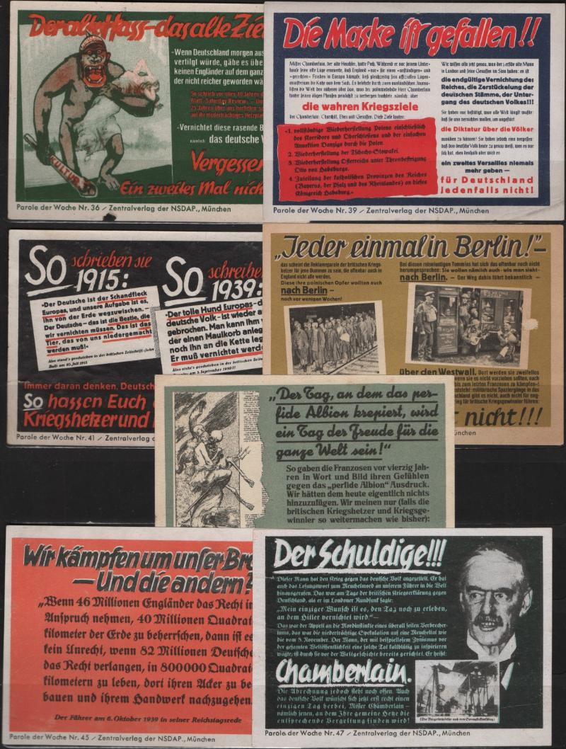 GERMANY Collection of smaller size propaganda labels "Parole der Woche" (Slogan of the Week); these were originally full outdoor poster-size propaganda broadsides plastered throughout the Reich 1936-1943, with these reduced size thin paper labels available, often affixed to covers; collection in stkbk of abt (105) labels and (11) covers w/ very little duplication; some images, mostly text w/ many exclamation marks! many reference Churchill; gen VF (Image)