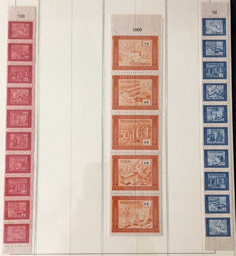POLAND Collection of (37) Prämienmarke ("reward stamps"); issued by the German Occupation authorities, these bonus stamps were given to laborers to encourage hard work, for which they would be rewarded with extra goods such as textiles, cigarettes, brandy, washing detergent, iron goods, leather and more; some in German, others bilingual, valued in points, different colors and designs; similar to postage stamps but w/o gum; attractive, VF (Image)