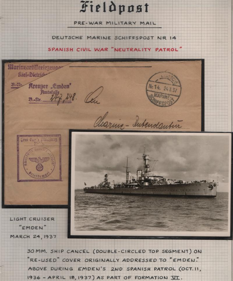 SPAIN Collection of covers & cards from German Naval excursions to Spain during the Civil War, and Propaganda covers, cards & labels promoting German-Spanish freindship; covers w/ handstamped ship names, naval postmarks, various handstamps, a few photos of the ships, postcards and markings for the return of the "German Legion" in the civil war; ships incl Emden, Leipzig, Köln, Nürnberg, Admiral Scheer, others; postcards are propaganda of Franco and his friendship w/ Germany, Condor Legion, Spanish covers w/ patriotic cachets, more; gen F-VF (Image)