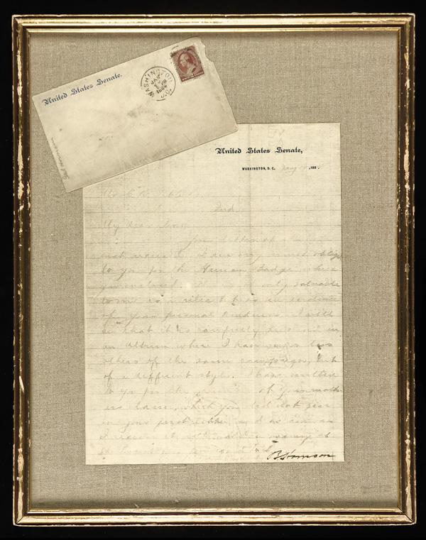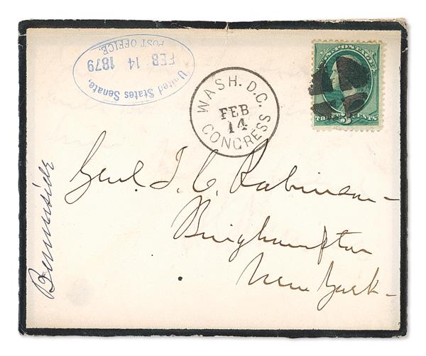 Outstanding Collection of Signed General William Ambrose "Burnside" Senate Mourning Letters and Cover, This 1879 mourning cover as well as three mourning letters are sent from Ambrose Burnside, famed Union Civil War General and U.S. Senator from Rhode Island. This mourning cover was sent during his tenure as a Senator and features the United States Senate postal cancel and Washington D.C. Congressional cancel as well. The letter was written to General John C. Robinson - another famed Union general. It appears that all of these items were written by Burnside and are appropriately signed by him on separate occassions. This is a magnificent collection of personal correspondence that are seldom seen from such a notable figure of the Civil War and Reconstruction Era. These items have not been authenticated by a third party. They are being sold as-is as a group and are not subject to return. We make every attempt to offer original signatures but in group lots we encourage the buyer to use their judgment. (Image)