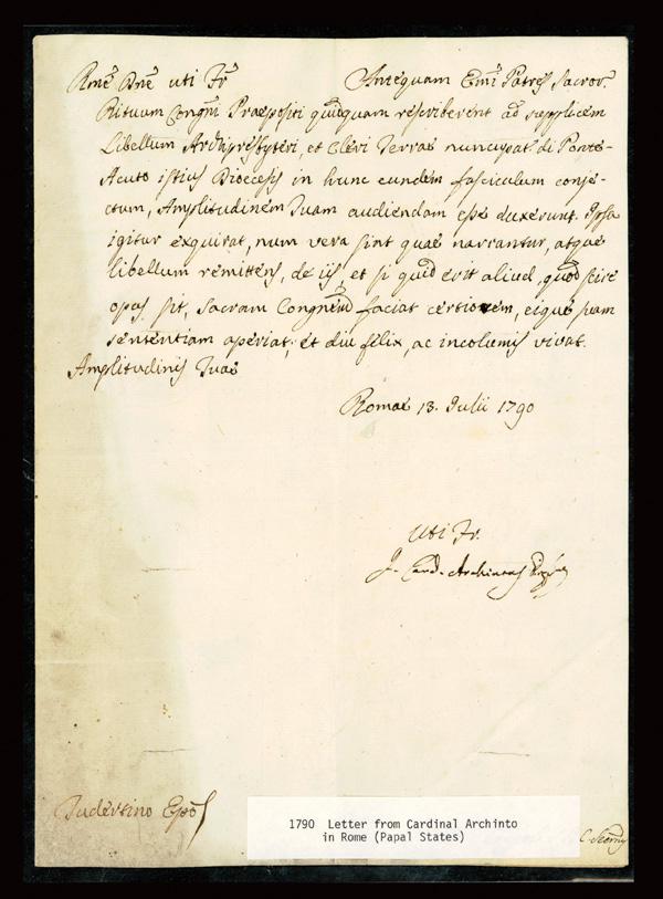 1790 Letter from Cardinal Archinto in Rome - Papal States, This 1790 letter was written, sent, and signed by Cardinal Archinto in Rome of the Papal States. It is in good condition and features the official seat of the Cardinal, unbroken. This item has been pre-certified from scans by leading authority and authenticator John Reznikoff at johnreznikoff.com. For a full certificate at a special discounted rate which requires sending the item in, contact john@universityarchives.com. (Image)