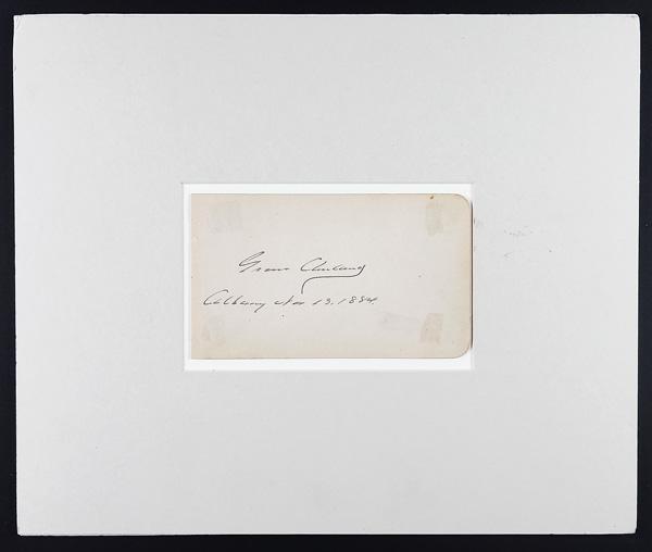 1884 President Grover Cleveland Signature on Card, This signature of President Grover Cleveland is framed on a paper background and is marked as being signed in Albany, New York in 1884. This item has been pre-certified from scans by leading authority and authenticator John Reznikoff at johnreznikoff.com. For a full certificate at a special discounted rate which requires sending the item in, contact john@universityarchives.com. Shipping charges apply - weight 1.2 lbs. (Image)