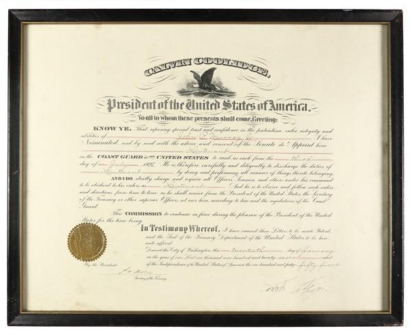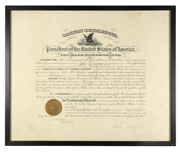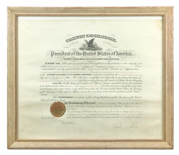 Calvin Coolidge Document Signed As President, document is a partially printed Coast Guard commission; in very good condition; please inspect; framed ready to be displayed. This item has been pre-certified from scans by leading authority and authenticator John Reznikoff at johnreznikoff.com. For a full certificate at a special discounted rate which requires sending the item in, contact john@universityarchives.com. (Image)