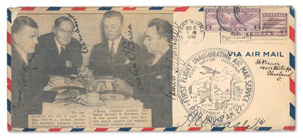 1930 Clarence Darrow Signed Fort Wayne, Indiana First Flight Cover, This unique 1930 first flight cover from Fort Wayne, Indiana to Cleveland, Ohio features a newspaper clipping of a roundtable of prominent religious figures as well as famed American lawyer Clarence Darrow - with signatures for all photographed. This cover features some general wear on its edges. This item has been previewed by our expert team and we believe this item is genuine and will receive a certificate stating the same. Please advise at the time of bidding if you wish for this lot to be sent in for a full certificate at our special discounted rate. (Image)