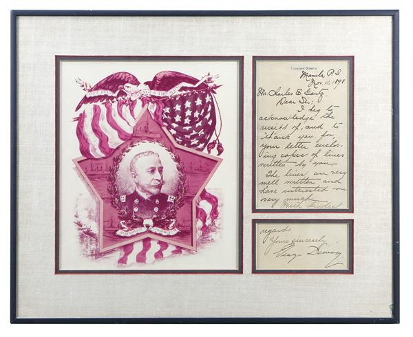 George Dewey, framed 1898 handwritten signed letter, on two statement sized pages with "Flagship Olympia" letterhead and datelined "Manila P.I. Nov. 11, 1898" that reads, "Mr. Charles E. Gantz, Dear Sir, I beg to acknowledge the receipt of, and to thank you for, your letter enclosing copies of lines written by you. The lines are very well written and have interested me very much. With kindest regards, Yours sincerely, George Dewey." with magenta image of Dewey in eagle and flag and five star design at left, frame measures 20½ x 16½ inches with a tiny piece of the glass out in bottom right corner (would be best to ship without the glass and frame to save on cost and high risk of glass shattering), Dewey's letter was written only six months after his fleet reached Manila Bay and defeated the Spanish. By March 1899, Dewey became the only person to be promoted to the rank of Admiral of the Navy. The recipient, Charles E. Gratz, worked at the Albany NY Journal for approximately 55 years, beginning as a route boy in 1857 at the age of 10 and eventually worked his way up to business manager, the position he held just prior to his death in 1915 at the age of 67. The only years he did not work at the Journal were his early years and his service during the Civil War as a member of the 7th New York Heavy Artillery, Co. B, participating in all the engagements of his regiment including SpottsylvanIa, Cold Harbor, before Petersburg and Strawberry Plains. His writings were pungent and he contributed frequently to other newspapers and magazines at that time and after he transferred his field of labor to the business office of the paper. He also wrote much topical verse which appeared frequently in the humorous periodicals., ex J. Leonard Diamond. This item has been previewed by our expert team and we believe this item is genuine and will receive a certificate stating the same. Please advise at the time of bidding if you wish for this lot to be sent in for a full certificate at our special discounted rate. (Image)