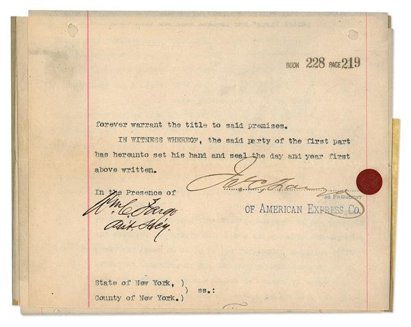 1901 J.C. Fargo Signed New York Land Sale Contract, This 1901 land contract is signed by James C. Fargo of the American Express Co. to indenture the sale of a tract of land in Manhattan, New York to the Hudson River Railroad Company for the sum of $150,000. His signature is featured prominently and boldly on the contract alongside that of his son, William G. Fargo. The contract has some tearing where it was folded on the final page that sports the signatures. This item has been previewed by our expert team and we believe this item is genuine and will receive a certificate stating the same. Please advise at the time of bidding if you wish for this lot to be sent in for a full certificate at our special discounted rate. (Image)