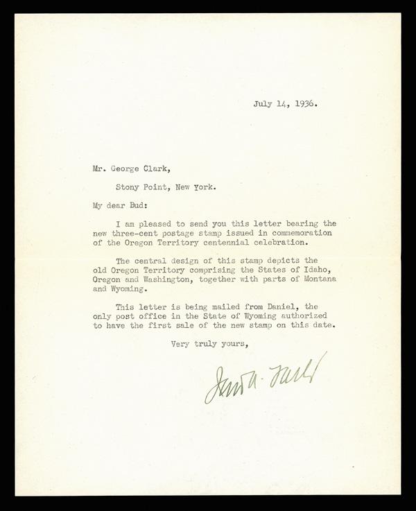 1936 Collection of Covers with Postmaster General Stationary Signed by James Farley, This collection of 1936 covers with letters were sent by Postmaster General James Farley to various addresses and people he knew personally - including his close friend George Clark. All covers were sent on Postmaster General covers and all contain letters signed by Farley. These items have been previewed by our expert team and we believe these items are genuine and will receive a certificate stating the same. Please advise at the time of bidding if you wish for this lot to be sent in for a full certificate at our special discounted rate. (Image)