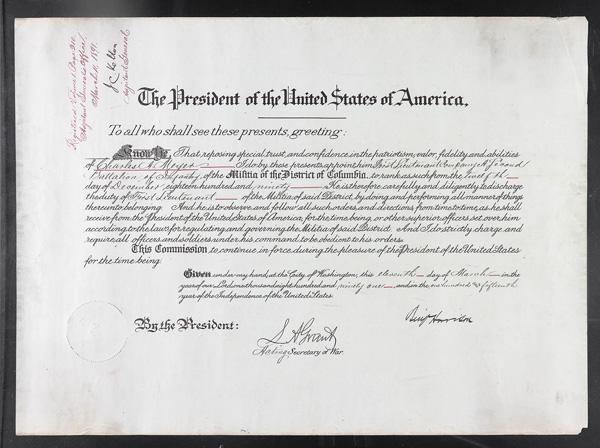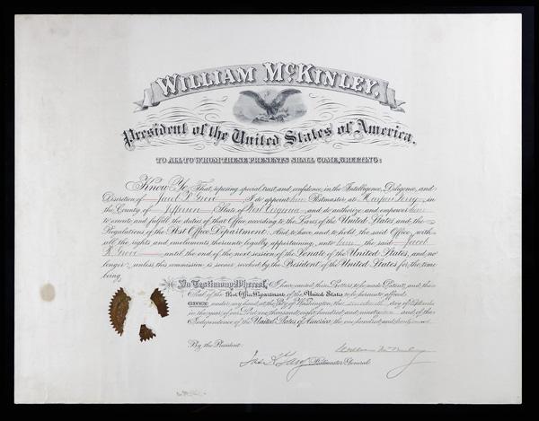 1897 William McKinley Signed Postmaster Appointment Document, This 1897 postmaster appointment is signed by President William McKinley and Postmaster James Gary. It was made out to the Postmaster of Harpers Ferry, West Virginia and signed on September 17, 1897. The seal on the document has been worn away and broken over time, and there is some general wear and staining. This item has been pre-certified from scans by leading authority and authenticator John Reznikoff at johnreznikoff.com. For a full certificate at a special discounted rate which requires sending the item in, contact john@universityarchives.com. Shipping charges apply - weight 1.9 lbs. (Image)