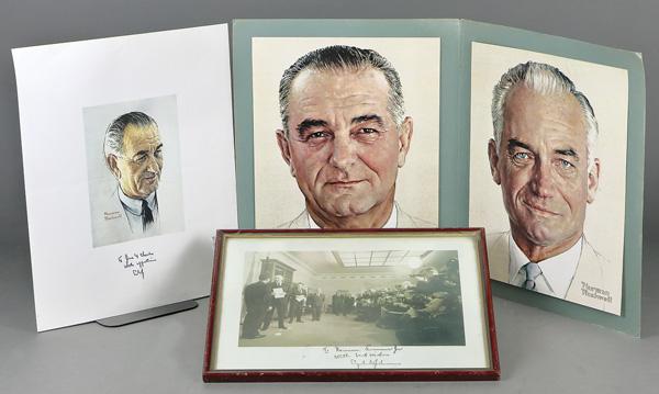 Collection of Signed President Lyndon B. Johnson Memorabilia, This collection of signed Lyndon B. Johnson memorabilia features a personalized, framed photograph as well as a note on the back from Juanita D. Roberts, the President's personal secretary. Additionally, a Norman Rockwell print that is signed to "Jane and Charles" is featured with an unsigned copy of Norman Rockwell's Shipping charges apply - weight 4.2 lbs. "The Candidates" from 1964 included. The framed photo sports notable wear and has been partly taped together, and the note from Juanita D. Roberts has some tearing. The signed Rockwell print has some slightly yellowing and a crease in the center. These items have been previewed by our expert team and we believe these items are genuine and will receive a certificate stating the same. Please advise at the time of bidding if you wish for this lot to be sent in for a full certificate at our special discounted rate. (Image)