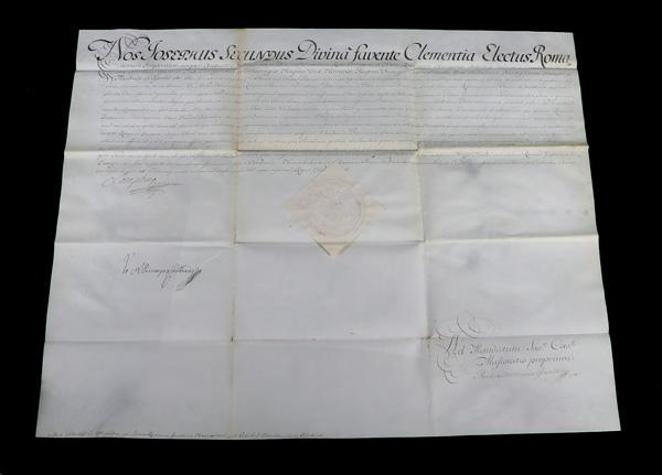 1770 Letters Patent Signed by Holy Roman Emperor Joseph II Regarding Franciscan Father in Palestine, This magnificent letters patent issued by Emperor Joseph II of the Holy Roman Emperor speaks about collecting alms for the Franciscan Fathers in Palestine, naming representatives. It is on parchment with a beautiful royal paper seal intact. This letter is marked as having been sent during his "sixth year of rule" in 1770. This is a magnificent piece of Catholic and Holy Roman Empire history with a very clear signature from the Emperor himself. This piece with such significant contents is seldom seen at auction. This item has been pre-certified from scans by leading authority and authenticator John Reznikoff at johnreznikoff.com. For a full certificate at a special discounted rate which requires sending the item in, contact john@universityarchives.com. (Image)