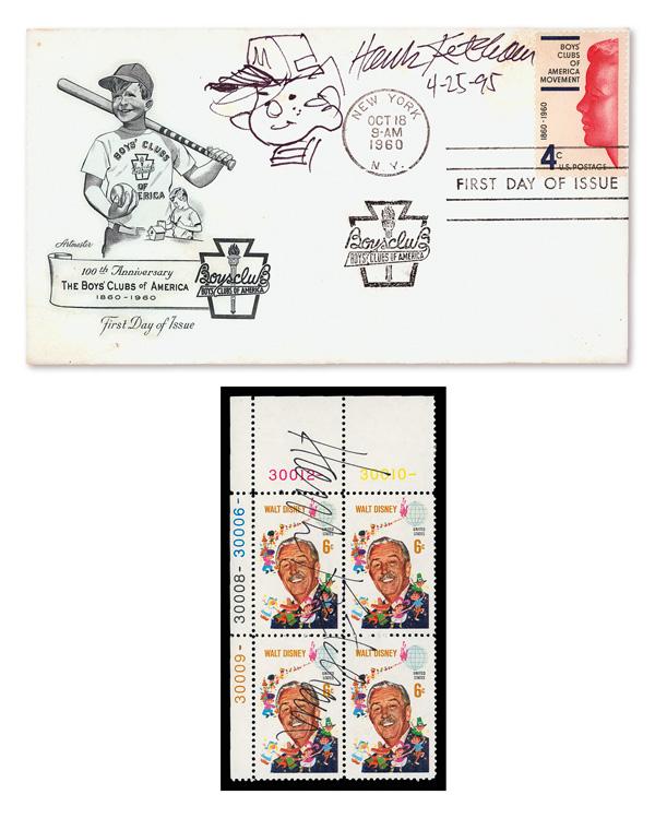 Hank Ketchum Autographs (Artist Of Dennis The Menace), on 6¢ Walt Disney Plate Block of 4 & on 4¢ 1960 Boys Clubs Of America 100th Anniversary FDC. These items have been previewed by our expert team and we believe these items are genuine and will receive a certificate stating the same. Please advise at the time of bidding if you wish for this lot to be sent in for a full certificate at our special discounted rate. (Image)