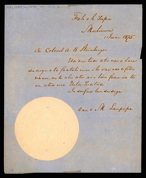 1875 King Malieto Laupepa King of Samoa Signed Letter to U.S. Colonel Albert Steinberger, This letter from King Malietoa Laupepa, the King of Samoa was sent to Colonel Albert Steinberger, the first Prime Minister of Samoa in 1875. It features the official seal of Samoa and is written in the Samoan language. The letter is a unique piece of Samoan history in good condition, with just a small tear on the right hand side of it. This item has been pre-certified from scans by leading authority and authenticator John Reznikoff at johnreznikoff.com. For a full certificate at a special discounted rate which requires sending the item in, contact john@universityarchives.com. (Image)
