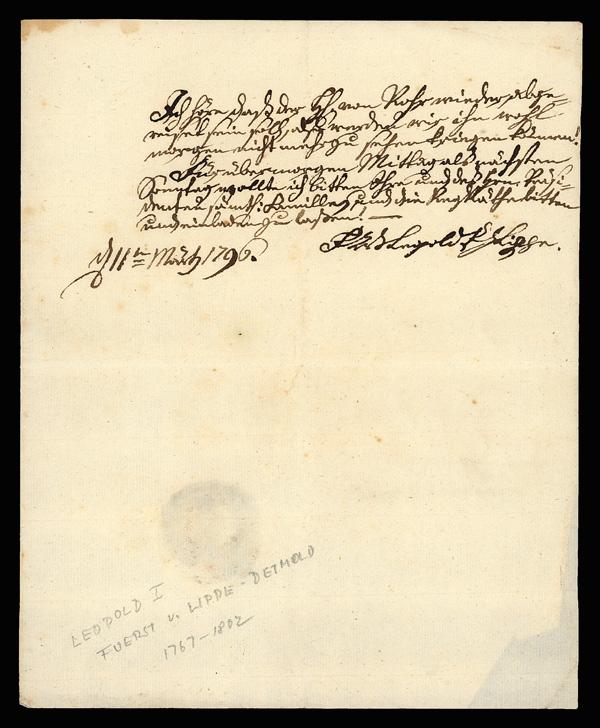 1796 Leopold I, Prince of Lippe Signed Letter, This signed letter that features the royal seal of Leopold I of Lippe's family is in very good condition, and a unique piece of German history. This item has been pre-certified from scans by leading authority and authenticator John Reznikoff at johnreznikoff.com. For a full certificate at a special discounted rate which requires sending the item in, contact john@universityarchives.com. (Image)