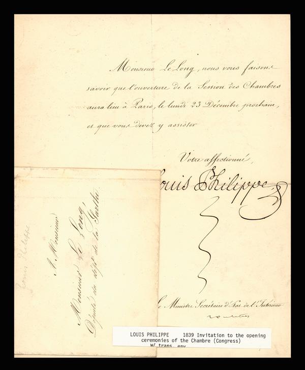 1839 King Louis Philippe I Signed Invitation and Envelope, This letter from King Louis Philippe (the "Citizen King") of France is an 1839 invitation to the opening ceremonies of the Chambre (Congress of France) with an official transit envelope. The letter and cover are in excellent condition with his signature prominently featured. This item has been pre-certified from scans by leading authority and authenticator John Reznikoff at johnreznikoff.com. For a full certificate at a special discounted rate which requires sending the item in, contact john@universityarchives.com. (Image)