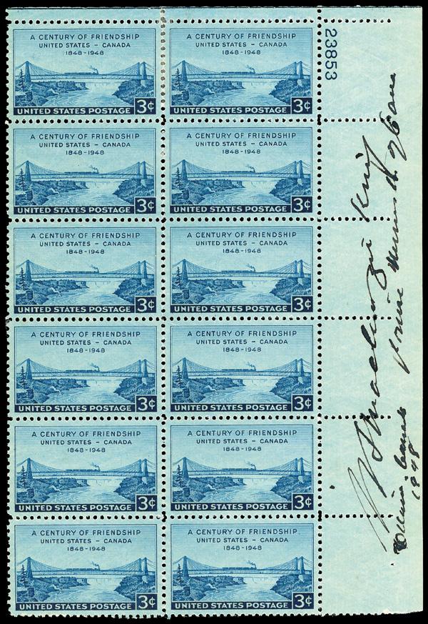 Canada Prime Minister William Lyon Mackenzie King Autograph on US Scott #961 Plate Block of 12, Scott #961 commemorated 100 years of friendship between the United States & Canada, signed in the selvage at the time of issuance of this stamp; it is dated 1948 & the Prime Minister included his title & his place of official residence, Ottawa, The Captiol Of Canada. (Image)